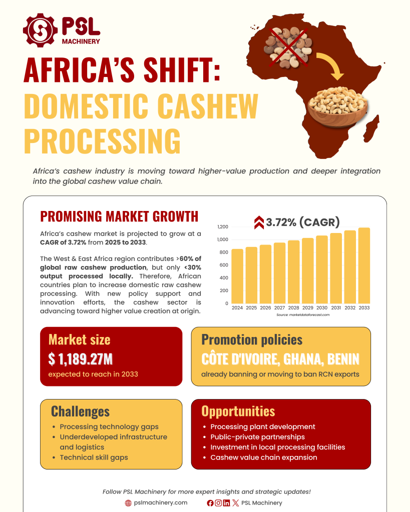 Major producing countries such as Côte d’Ivoire, Ghana, and others are increasingly prioritizing domestic processing and value addition rather than exporting raw cashew nuts. This strategic shift aims to capture greater economic value within producing countries while strengthening local agro-industrial development.